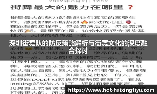 本篇文章旨在深入探讨深圳街舞队的防反策略以及与街舞文化的深度融合。首先,我们将从防反策略的定义与重要性入手,分析其在街舞比赛和表演中的应用。接着,围绕深圳地区独特的街舞文化背景,阐述如何通过这些策略提升团队整体实力,以及促进成员之间的默契与合作。随后,我们将分析深圳街舞队在防反策略实施过程中所面对的挑战和解决方案,包括技术训练、战术配合以及心理素质等方面的提升。最后,通过总结深圳街舞队在文化传承与创新中所取得的成果,以期为未来的发展提供指导和借鉴。